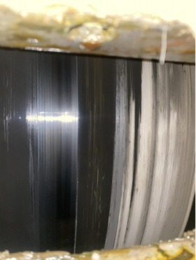 • Отклонение от цилиндричности разгрузочной цапфы незначительно превышает допустимое значение (0,7 мм при допустимом 0,5 мм). Состояние поверхностей катания цапф указывает на выработку вкладышей подшипников скольжения. Рекомендуется замена вкладышей и шлифовка поверхности катания разгрузочной цапфы для обеспечения пятна контакта по всей ширине.